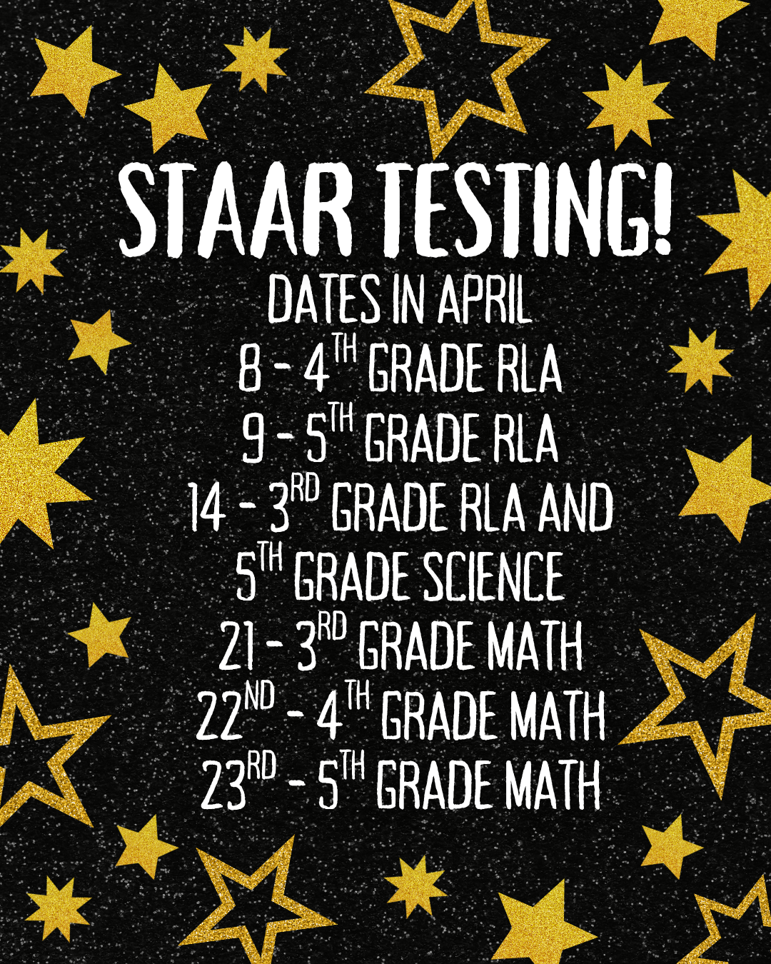 It's our first week of STAAR testing!Remember we are a closed campus all of April for visitors. Testers - please get to bed early before your test so you can get plenty of sleep!