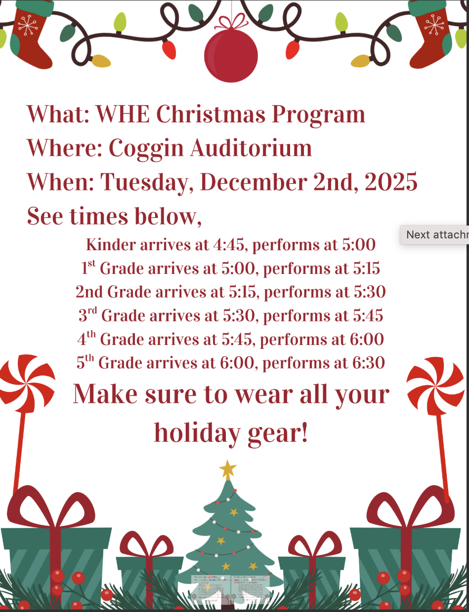 Reminder about our Christmas Program for K-5 tomorrow evening. Directions attached, as well. Please drop students at the cafeteria before proceeding inside. Reminder to please respect our performe...