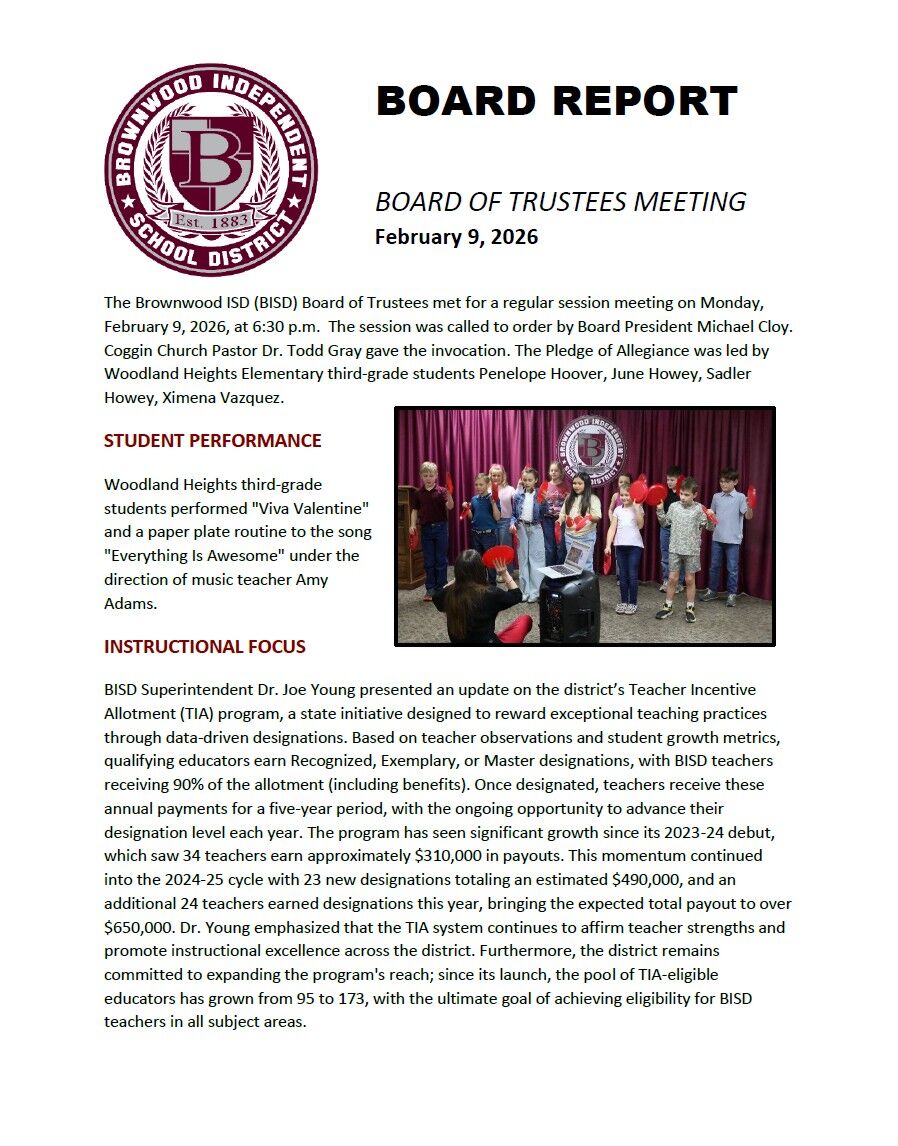 Brownwood ISD has released the following Board Report summarizing the events from the recent Board of Trustees meeting held on February 9, 2026. Click the report preview or use the link provided to...