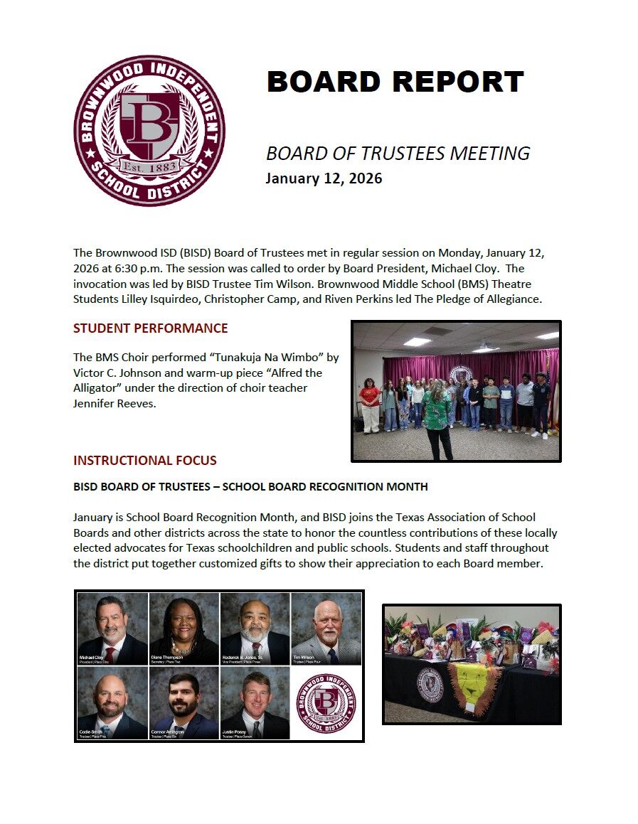 Brownwood ISD has released the following Board Report summarizing the events from the recent Board of Trustees meeting held on January 12, 2026. Click the report preview or use the link provided to...